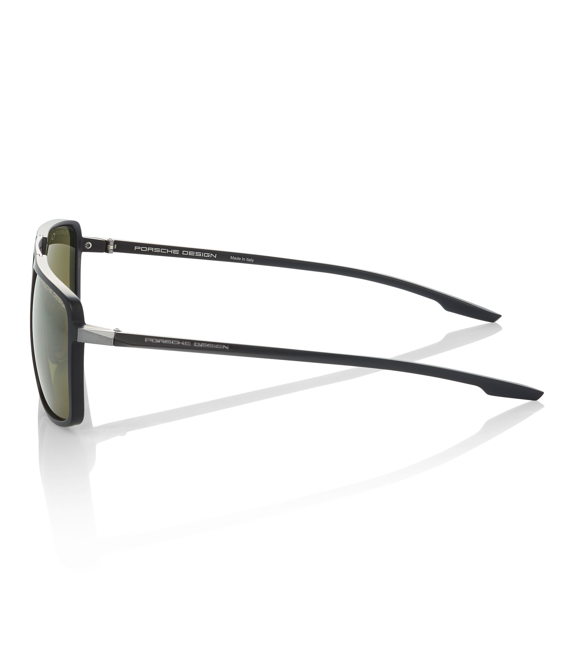 An exciting, masculine design language – inspired by the characteristics of futuristic automotive design: Porsche Design P´8934 sunglasses from the new Cyber Tec series feature an impressive futuristic-looking frame with double bridge and 3-dimensional temple design and a striking interplay of stainless steel and high-performance RXP®. The unique look of these sunglasses takes its inspiration from details found in Porsche sports cars. The striking, clean lines of the Porsche 911 GT2 RS have been translated into complex, three-dimensional temples. The result: A characteristic edge that also gives the glasses a unique dynamic when viewed from the side. Sculptural temple tips that echo the style of the Porsche 911 rear lights underline the progressive style inspired by automotive engineering.Available in colorway A (black) with innovative VISION DRIVE Polarized XTR lens technology, and in colorway D (gray, gold) with VISION DRIVE Polarized lenses.